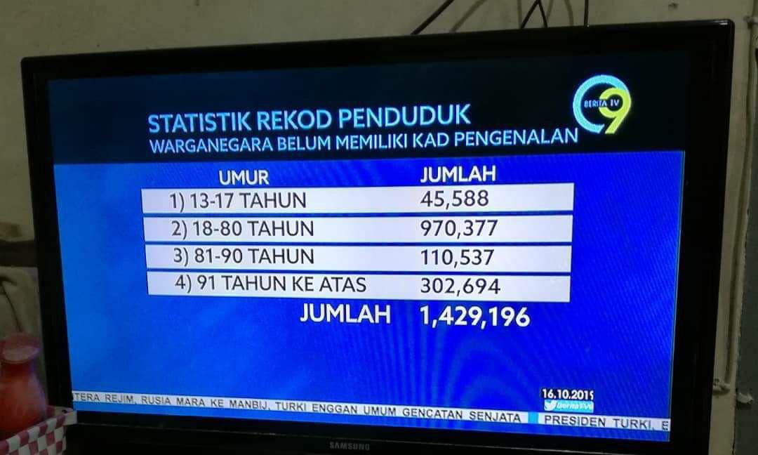 Berdasarkan statistik Jabatan Pendaftaran Negara (JPN), daripada jumlah 1.4 juta itu, 45,588 orang adalah mereka yang berusia 13-17 tahun, 970,377 (18-80 tahun), 110, 537 (81-90 tahun) dan 302,694 (91 tahun ke atas).