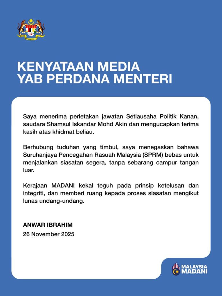 Perdana Menteri Datuk Seri Anwar Ibrahim mengesahkan menerima surat peletakan jawatan Setiausaha Politik Kanan, Shamsul Iskandar Mohd Akin, dan mengucapkan terima kasih atas khidmatnya. Beliau menegaskan bahawa SPRM bebas menjalankan siasatan segera tanpa campur tangan berhubung dakwaan rasuah yang tular, sejajar dengan prinsip ketelusan dan integriti Kerajaan MADANI.