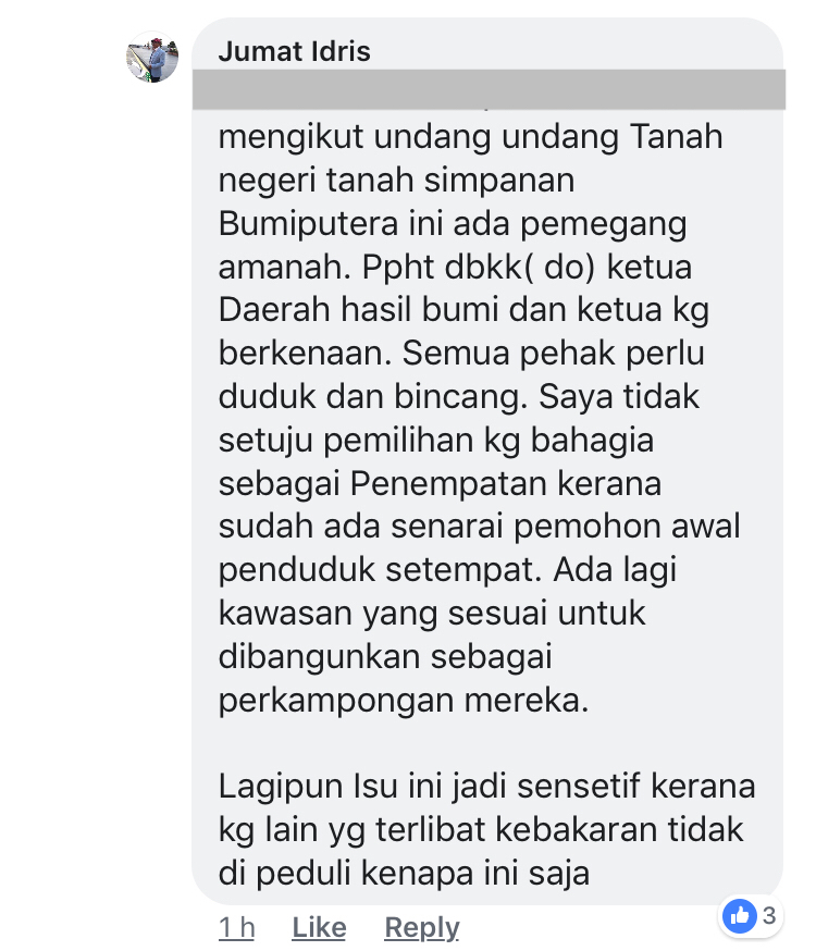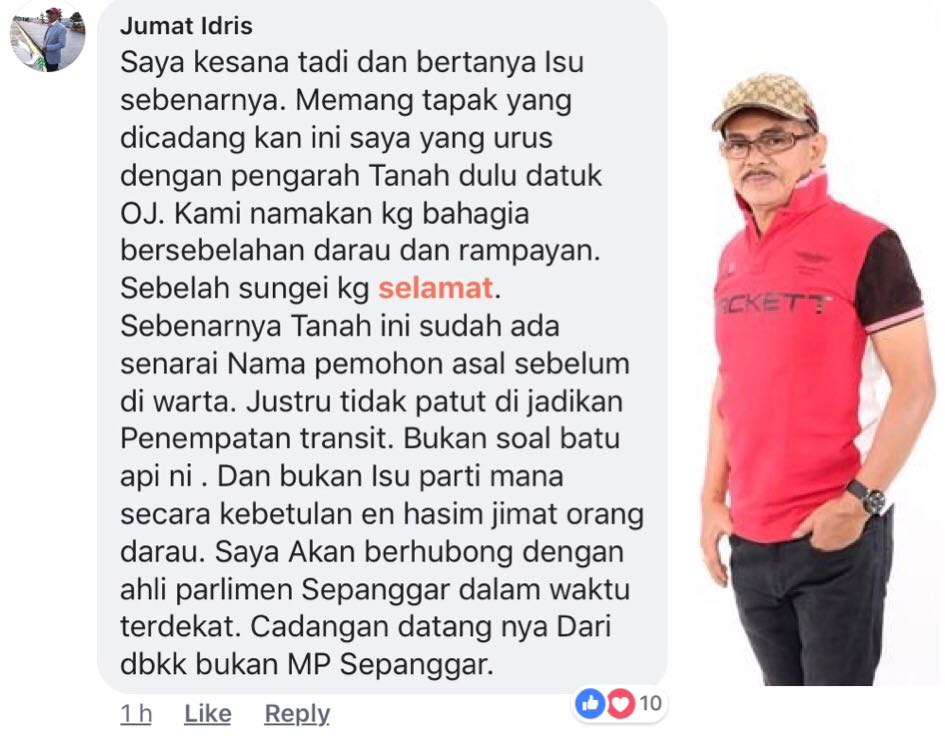 “Sebenarnya tanah ini sudah ada senarai nama pemohon asal sebelum di wartakan. Justeru tidak patut dijadikan penempatan transit’. katanya dalam facebook.