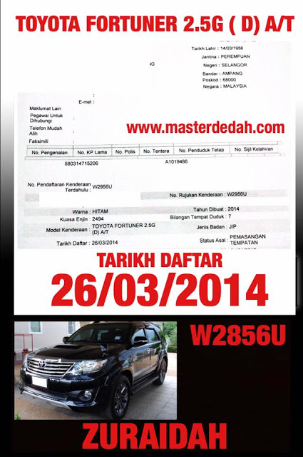 W2956U - TOYOTA FORTUNER 2.5G : Didaftarkan pada 26 Mac 2014. CKD. Harga dipasaran RM180K- RM200K