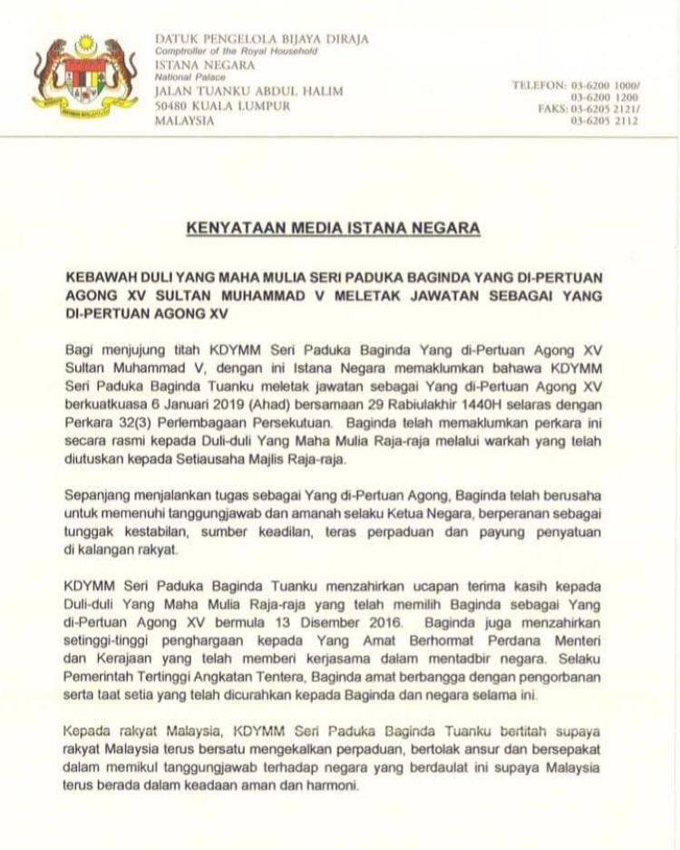 "Bagi menjunjung titah Kebawah Duli Yang Maha Mulia (KDYMM) Seri Paduka Baginda Yang di-Pertuan Agong XV, Sultan Muhammad V, dengan ini Istana Negara memaklumkan bahawa KDYMM Seri Paduka Baginda Tuanku meletak jawatan sebagai Yang di-Pertuan Agong XV berkuat kuasa 6 Januari (Ahad) bersamaan 29 Rabiulakhir 1440H selaras Perkara 32(3) Perlembagaan Persekutuan.