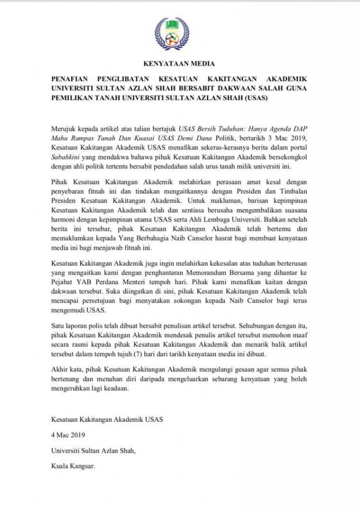 KUALA KANGSAR - Kesatuan Kakitangan Akademik Universiti Sultan Azlan Shah (USAS) menafikan laporan berita salah sebuah portal tempatan mendakwa pihaknya bersekongkol dengan ahli politik DAP bersabit pendedahan salah urus tanah milik universiti itu.