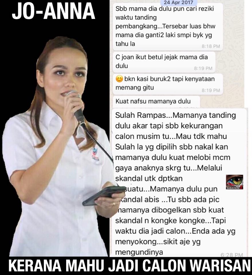 “Jo-Ana Rampas sekarang berkempen untuk PAWAS Shafie Apdal..dulu jadi girlfriend Marzuki Nasir yang kini adalah pemangku Ketua Pemuda Semporna…habis dikikis si Marzuki kau minta beli kereta, bayar bil rumah dan bil-bil lain, ko cukur habis endingnya kau kahwin dengan orang lain…” kata seorang pengguna facebook bernama Putra Indra.