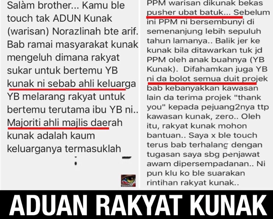 “... masyarakat kunak mengeluh dimana rakyat sukar bertemu YB Kunak ini sebab ahli keluarga YB melarang rakyat bertemu terutama ibu YB ini.