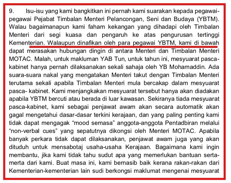 Kepada Setiausaha Sulit Kanan (SUSK) Menteri Pelancongan, Seni dan Budaya mohon ambil tindakan tegas. Kamu adalah ketua jabatan di pejabat Menteri. Taraf kamu dari sudut hierarki pejabat Menteri adalah sama dengan KSU. Kamu menjadi penghubung kepada semua pegawai kanan, jabatan, agensi, badan berkanun dan GLC. Malah kamu berhak masuk di semua mesyuarat kementerian atas arahan Menteri. Ibaratnya jika Menteri tiada dipejabat SUSKlah menjadi wakil menteri di pejabat. Selagi tidak menyalahi dan fungsi Setiausaha Sulit Kanan Menteri. SUSK perlu melawan ke depan. Jangan biar Menteri dibodohkan oleh Pegawai Kanan (PTD) di Kementerian. Jika kamu bukan PTD tetap tetapi kontrak apa kamu mahu takut. Lawan. Pertahan majikan. Itu kuasa kamu.