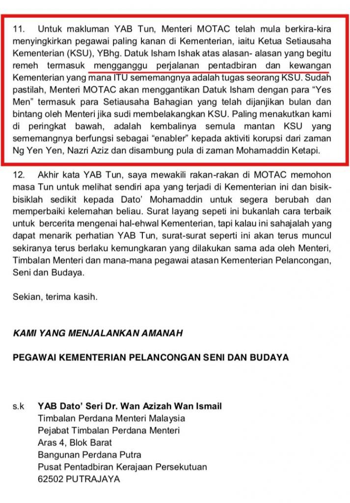 Baru ini tular dalam aplikasi whatsapps surat layang bertarikh 15 Jun 2019 di alamatkan kepada Perdana Menteri Malaysia berhubung luahan hati penjawat awam di Kementerian Pelancongan, Seni dan Budaya terhadap Menterinya Datuk Mohammadin Ketapi.