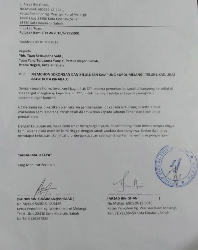 Surat permohonan tanah itu ialah di Kampung Kurol Melangi Teluk Likas ditandatangani oleh dua individu iaitu Arsad Ghani dan Sainin Sulaiman yang memaklumkan senarai 674 peserta permohonan lot tanah di kampung itu dengan menggunakan sokongan TYT Sabah.