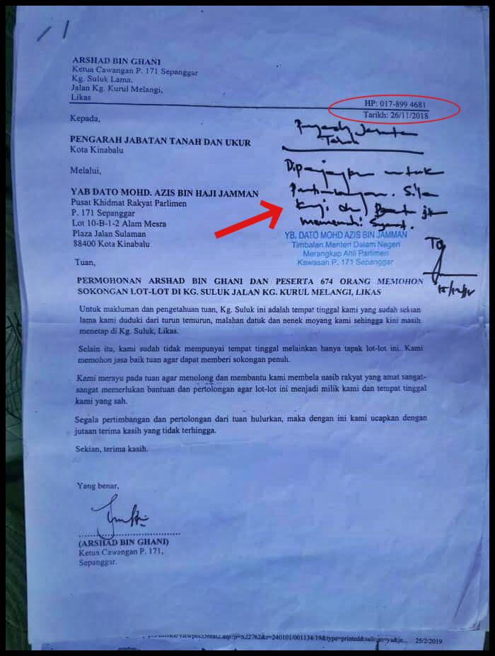 Sebagaimana surat Arsad Ghani Ketua Cawangan Warisan Kg Suluk Lama Kurol Melangi Likas yang mendapat sokongan minit sokongan Datuk Azis Jamman Ahli Parlimen Sepanggar tular apabila pemimpin Warisan tempatan mula menyalahgunakan surat berkenaan sehingga menceroboh tanah milik orang lain.
