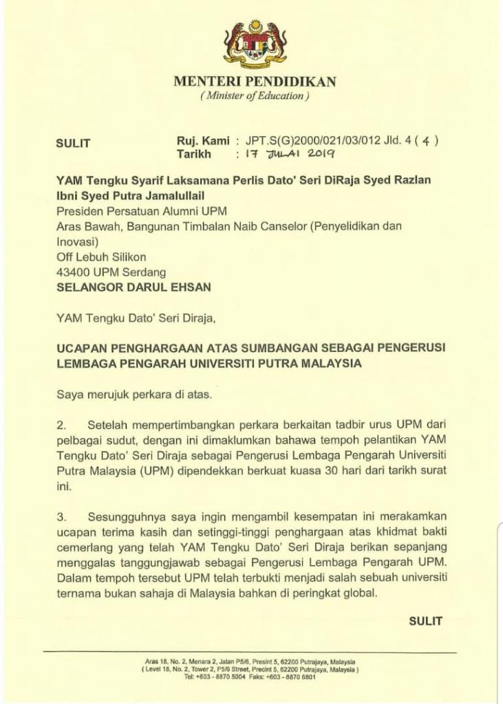 Bimbang terungkit semua perkara, Syed Razlan dipecat melalui sepucuk surat bertarikh 17 Julai, yang ditandatangani oleh Dr Maszlee. Dalam masa sama membuat pelantikan Pengerusi Lembaga Pengarah UPM yang baru kepada Tan Sri Dr Ghauth Jasmon bekas naib canselor Universiti Malaya (UM) berkuat kuasa 19 Ogos ini. Surat pelantikannya yang ditandatangani Dr Maszlee, juga bertarikh 17 Julai turut dalam laman sosial.