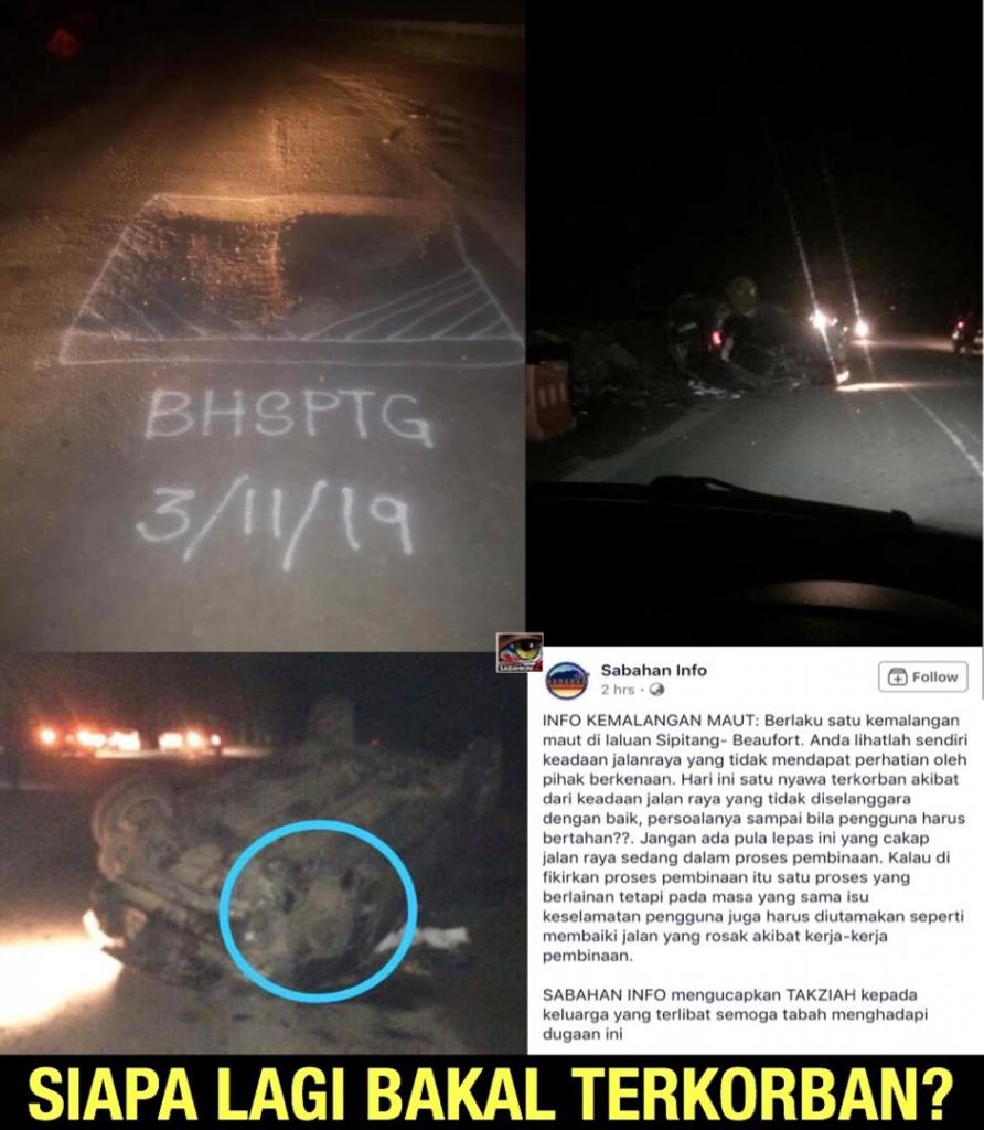 BEAUFORT: Sekalipun begitu banyak aduan terhadap kerosakan jalan yang menyebabkan kereta rosak termasuk menanam pokok pisang di jalan berlubang namun tiada tindakan daripada JKR Sabah sehinggalah semalam seorang lelaki maut selepas tercampak keluar dari kereta dipandunya di Kilometer 25, Jalan Beaufort – Sipitang.