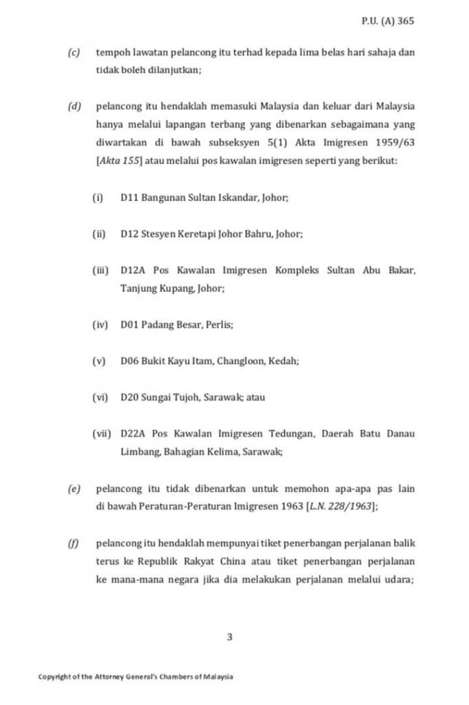 Pelancong dari negara itu hanya dibenarkan memasuki dan keluar Malaysia dari tujuh lokasi pos kawalan imigresen yang ditetapkan.