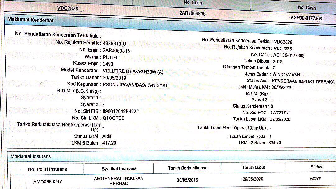 Semakan Sabahkini2.com kenderaan Vellfire VDC2828 memang atas nama syarikat Education Malaysia Global Services.