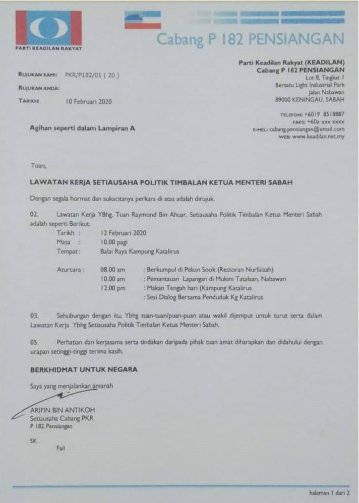 Surat itu, yang ditandatangani Setiausaha PKR Pensiangan Arifin Antikoh, mempunyai kepala surat PKR dan bukannya surat pejabat Setiausaha politik atau kerajaan negeri.
