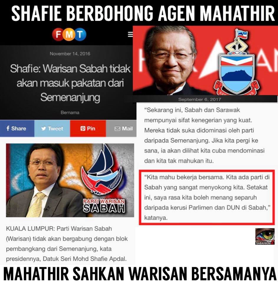 Jadi bagaimanakah lagi rakyat Sabah boleh mempercayai Shafie Apdal dan Warisan yang bersekongkol dengan Tun Mahathir yang anti Sabah serta kaki rasuah ini? Sentimen Sabahan tidak mahu "Mahathir". Tiba-tiba Mahathir mengetuai Pakatan Harapan di Semenanjung dan Parti Warisan menjadi ahlinya.