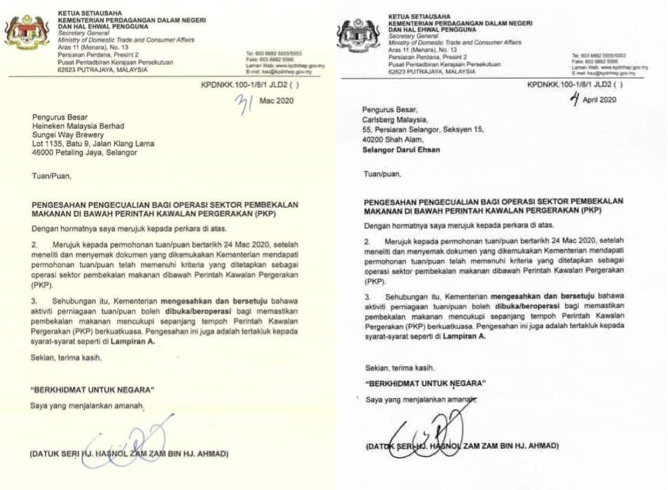 KUALA LUMPUR: Dua surat dari Kementerian Perdagangan Dalam Negeri dan Hal Ehwal Pengguna (KPDNHEP) yang memberi pengecualian kepada syarikat arak, Heineken Malaysia Bhd dan Carlsberg untuk beroperasi ketika PKP tular di media sosial.