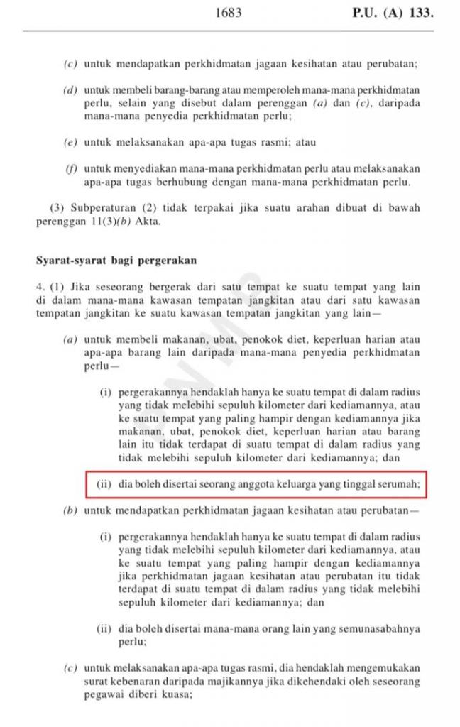 Warta kerajaan tersebut menyebut, Seksyen 4(1)(a)(ii) peraturan itu menyebut individu yang keluar bersama itu mestilah merupakan anggota keluarga yang tinggal serumah.