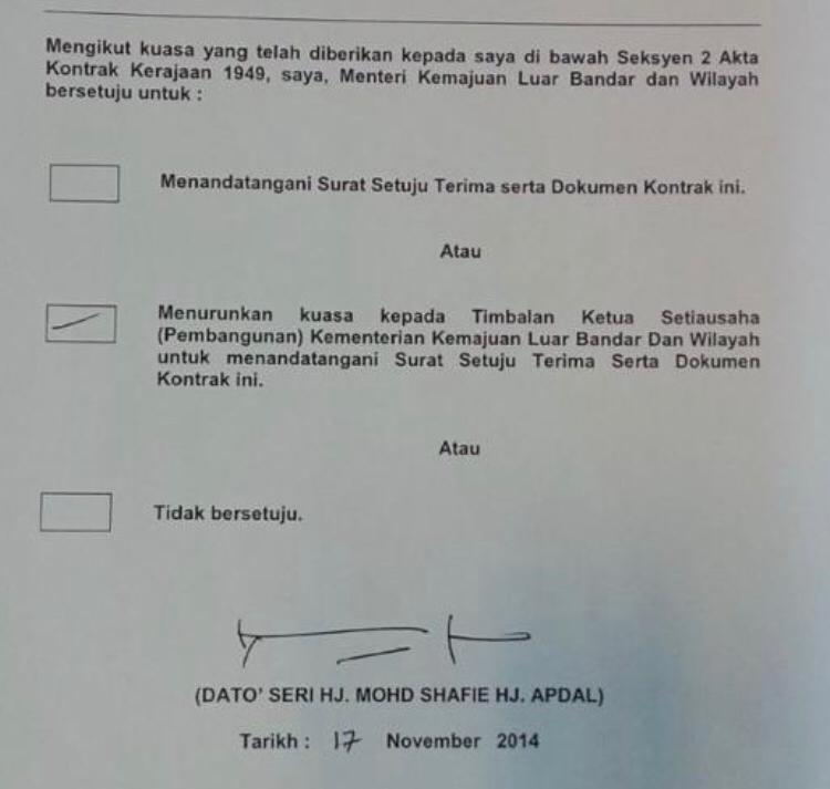 Menteri baharu KPLB pula tiada pilihan kerana itu sebahagian prosedur kerajaan menyegerakan projek kerajaan dan menerima perakuan KSU KPLB itu atas nasihat KSU. Sepatutnya KSU menasihati menteri membatal atau menangguhkan semula projek ini agar penilaian perlu dibuat semula mengapa memilih nilai projek lebih tinggi RM142.7 juta. KSU dapat habuan maka tandatangan sahajalah.