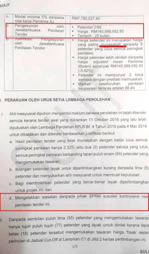 Maka ulasan Pegawai KPLB dalam tender 'Mengelakkan siasatan daripada pihak SPRM susulan kontroversi hasil penilaian tender ini" hanyalah ulasan sampah. Cuba beri jawapan bagaimana syarikat lebih tinggi RM2 juta boleh diberi tender ini?