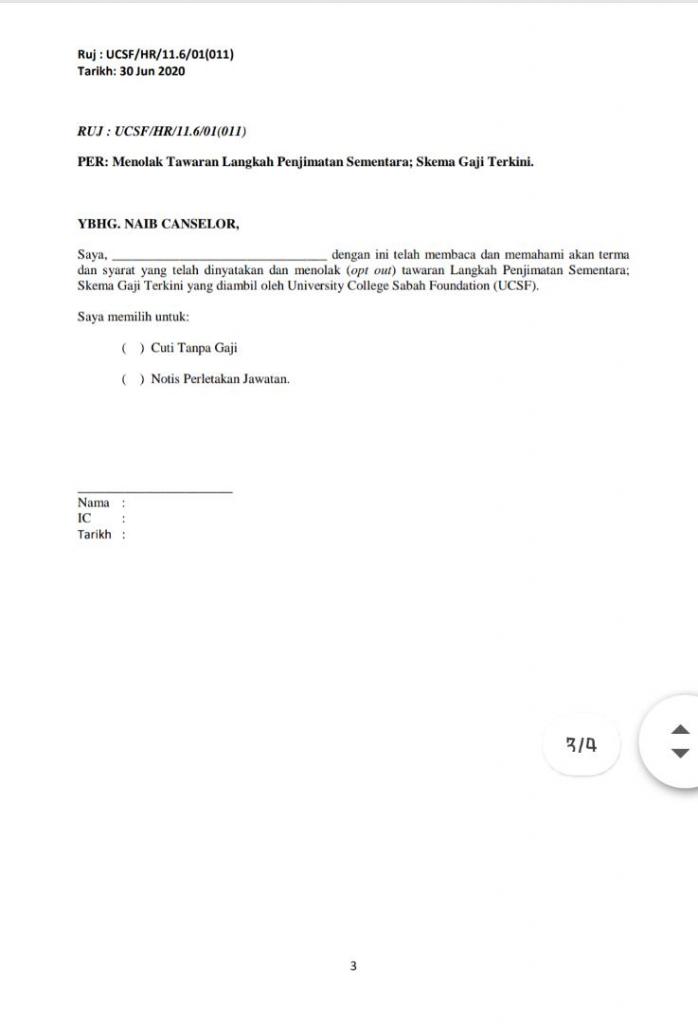 Selepas dilaporkan Kolej Universiti Yayasan Sabah (UCSF) merancang mengurangkan gaji kakitangan sehingga sebanyak 50 peratus dan mungkin memberhentikan pekerjanya hari ini memo Naib Canselor UCSF itu mengarahkan semua staf yang belum menandatangani langkah penjimatan sementara (TAM) memilih sama ada cuti tanpa gaji atau Notis peletakan jawatan.