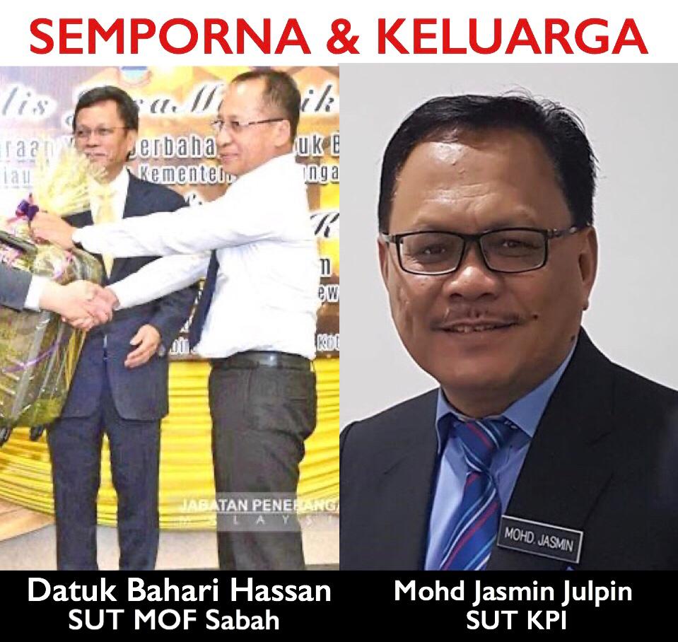Siapa Setiausaha Tetap Kementerian Kewangan Sabah, anak guru Hasan si Bahari Hasan (Datuk Bahari Hassan) Sekarang ini, siapa Setiausaha Tetap Kementerian Pembangunan Infrastruktur si Jasmin (Mohd Jasmin Bin Julpin) siapa lagi?” katanya