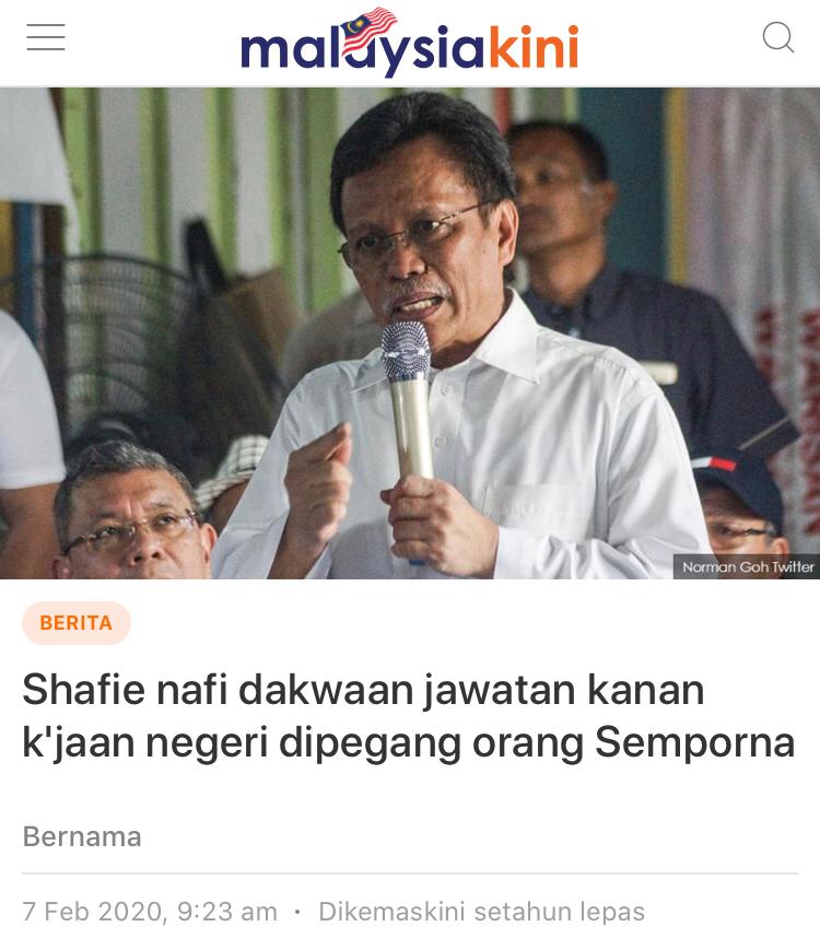 Februari lalu Shafie Apdal tampil menafikan beliau telah melantik individu dari Semporna dan keluarganya. Katanya hanya lapan daripada 120 jawatan kanan dalam kerajaan negeri diisi oleh individu dari Semporna, SUT pun hanya satu manakala selebihnya dari daerah lain. Benarkah?
