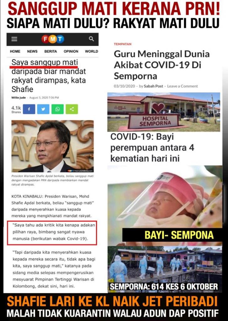 Lihat saja kes Covid-19 di Parlimen Semporna. 6 Oktober 2020 saja kes kumulatif 614 kes dan bakal terus bertambah dari masa ke semasa. Siapa yang menjadi mangsa? Shafie dan keluarga? tidak. Rakyatnya di Sabah dan Semporna yang sengsara malah bayi terkena jangkitan korban terbaru meninggal kerana Covid-19.