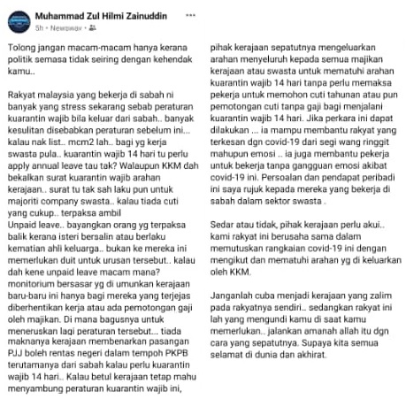 Netizen juga menyokong cadangan tidak perlu lagi kuarantin 14 hari jika keluar daripada Sabah lagi kerana ia sangat membebankan serta menyusahkan.