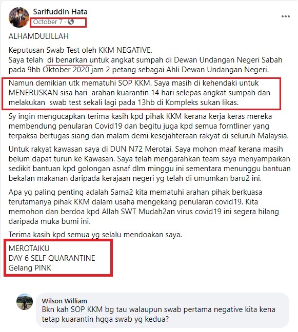 Adun Warisan 6 hari Kuarantin dah ok boleh keluar hanya dengan WhatsApp Pengarah JKNS..