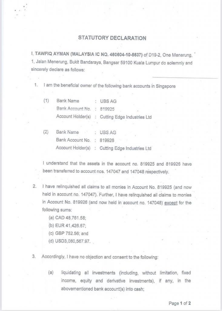 Wang itu dalam akaun syarikat Cutting Edge Industries di Singapura dan mereka bertiga mengakui pemilik akaun itu. Ia menunjukkan Conflict of Interest Zeti sebagai bekas Gabenor BNM apabila keluarganya menerima wang Jho Low itu.