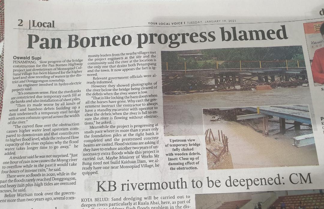 Isu banjir di Penampang sering juga dikaitkan dengan pembinaan jalan, jejambat malah sambungan projek Jan Pan Borneo. Kontraktor Azam Jaya turut membina Pakej 6 Pan Borneo bernilai RM788 juta dari Putatan ke Inanam. Azam Jaya selama ini sangat kebal dengan teguran. Mereka tak kisah duduk di kerajaan BN atau Warisan PH projek mereka terus berjalan. Azam Jaya bijak membeli jiwa wakil rakyat. Banjir tak banjir mereka tak kisah.