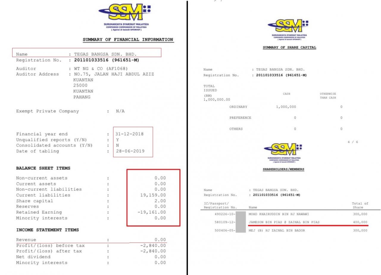 Semakan SSM menunjukkan antara lembaga pengarah syarikat Tegas Bangsa Sdn Bhd ialah Mohd Khairuddin Bin Hj Nawawi, Mej (B) Hj Zainal Bin Bador dan Jameson Bin Pias @ Zainal Bin Pias . Orang kanan Tan Sri Desmond Lim dalam Syarikat Tegas Bangsa Sdn Bhd ialah Jameson Pias.