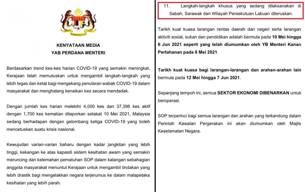 Hari ini Muhyiddin mengumumkan PKP di seluruh negara dengan langkah khusus yang sedang dilakukan di Sabah, Sarawak dan Labuan diteruskan.