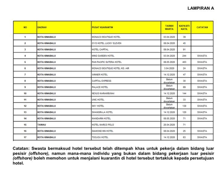 Sekiranya pusat kuarantin tidak mencukupi, bilangan hotel yang dijadikan pusat kuarantin akan ditambah dari masa ke semasa.