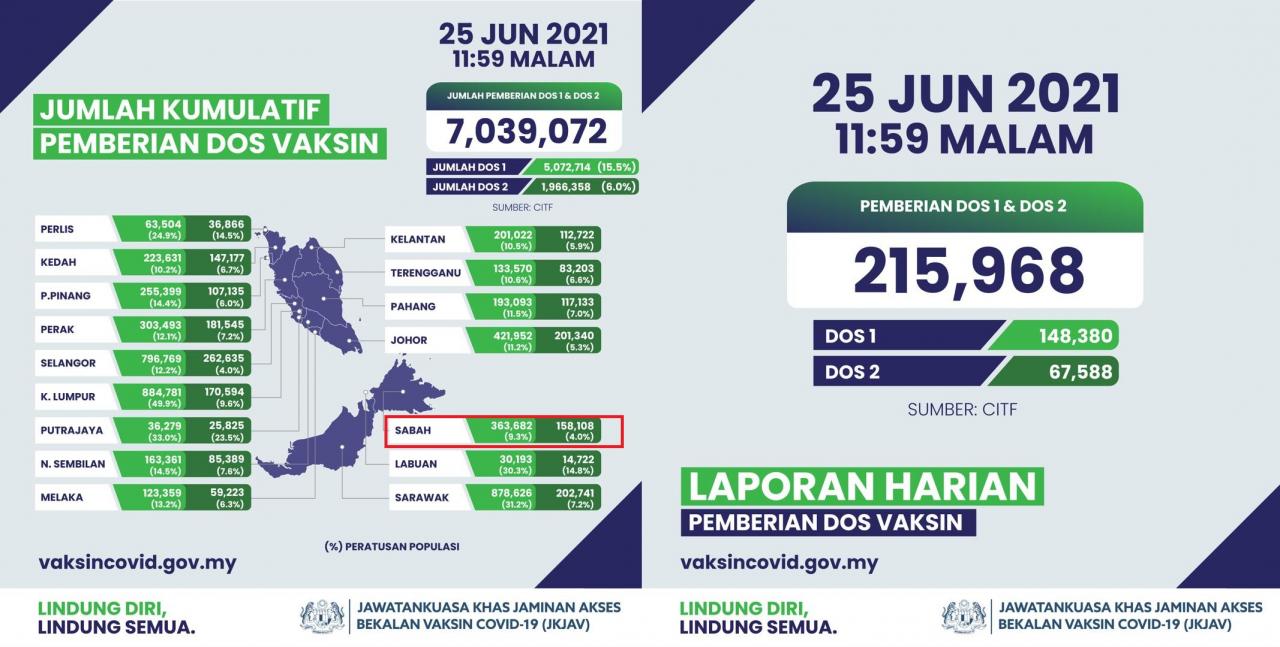 Data menunjukkan jumlah pemberian vaksin COVID-19 negara setakat 25 Jun 2021 ialah 7,039,072 dos iaitu 5,072,714 orang menerima dos pertama dan 1,966,358 orang terima dos kedua. 215,968 dos harian dapat dilakukan.