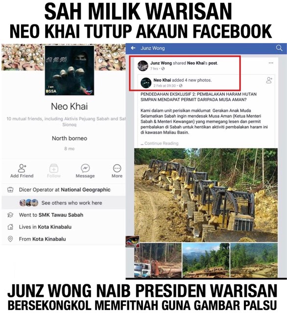 4 februari lalu Sabahkini2 telah mendedahkan seorang penyokong Warisan tegar menggunakan nama Facebook Neo Khai memfitnah Ketua Menteri Sabah, kerajaan negeri dan Jabatan Perhutanan menggunakan imej-imej PALSU yang pernah ditularkan pada tahun 2016. Satu laporan polis dibuat oleh Datuk Zulkarnain Mahdar Presiden Gerakan Akar Umbi UMNO Malaysia (GAUM) namun akaun facebook palsu tersebut telah ditutup.