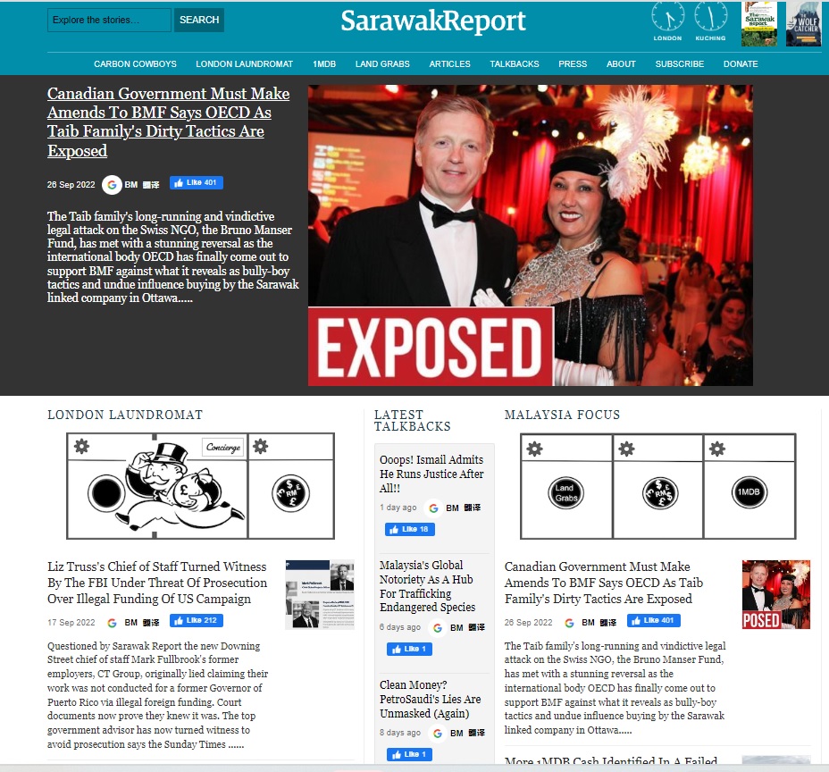 Cuba baca laporan Sarawak Report sekarang yang diberi pelepasan SKMM hari-hari menyerang keluarga Tuan Yang Terutama Yang di-Pertua Negeri Sarawak Tun Pehin Sri Haji Abdul Taib Mahmud. Serangan semacam Sarawak Report ni ok ke di mata SKMM? Boleh ke Sarawak Report berbuat demikian? Tiada laporan polis kerajaan negeri Sarawak atau Tun Pehin Sri TYT terhadap Sarawak Report maka tak mengapa semua ok.