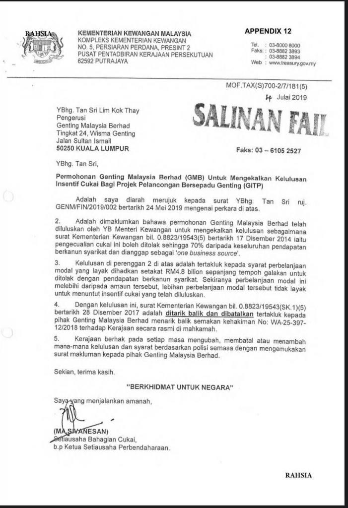 Hebat Genting Malaysia Berhad bayar kepada Kerajaan PH RM514 juta pada April 2019 dan kemudian pada julai 2019 diberi pula pelepasan cukai sehingga RM4.8 bilion.