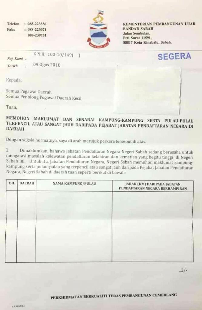 Surat bertarikh 9 Ogos 2018 rujukan KPLB: 100-10/149 ( ) dari Kementerian Luar Bandar Sabah (KPLB) kepada semua pegawai daerah dan penolong pegawai daerah kecil itu dikatakan adalah arahan dari Shafie Apdal untuk membantu Jabatan Pendaftaran atas alasan mengatasi kelewatan pendaftaran kelahiran dan kematian di Sabah yang tinggi