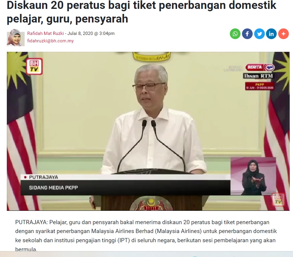 Setidakya ketika BN dan PN berkuasa Dato' Sri Ismail Sabri sebagai Menteri Kanan Pertahanan  terdapat usaha memberi diskaun harga tiket kepada pelajar, guru dan pensyarah 20 peratus bagi tiket penerbangan dengan syarikat penerbangan Malaysia Airlines Berhad (Malaysia Airlines) untuk penerbangan domestik ke sekolah dan institusi pengajian tinggi (IPT) di seluruh negara selepas PKP. Diskaun diberikan untuk tempoh tertentu bagi perjalanan pulang semula ke sekolah atau IPT masing-masing.