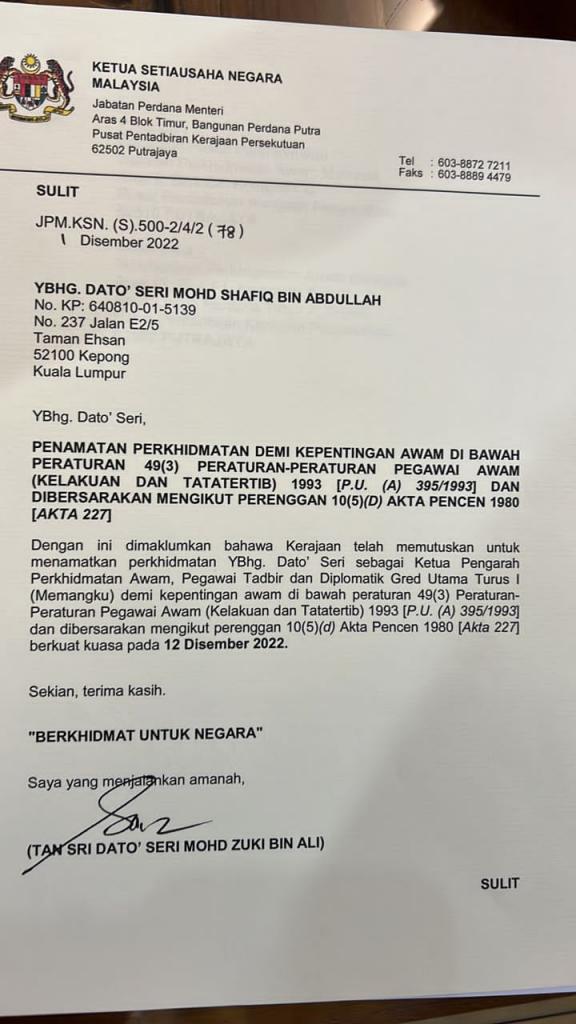“Dengan ini dimaklumkan bahawa kerajaan telah memutuskan untuk menamatkan perkhidmatan YBhg. Dato’ Seri sebagai Ketua Pengarah Perkhidmatan Awam, Pegawai Tadbir dan Diplomatik Gred Utama Turus 1 (Memangku) demi kepentingan awam di bawah peraturan 49 (3) Peraturan -peraturan Pegawai Awam (Kelakuan dan Tatatertib)1993 (P.U. (A) 395/1993) dan dibersarakan mengikut Perenggan 10 (5) (D) Akta Pencen1980 [Akta 227) berkuatkuasa 12 Disember 2022.