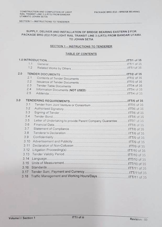 1. SUPPLY, DELIVERY AND INSTALLATION OF BRIDGE BEARING WESTERN 1 FOR PACKAGE BRG (W) 1 FOR LIGHT RAIL TRANSIT LINE 3 (LRT 3) FROM BANDAR UTAMA TO JOHAN SETIA