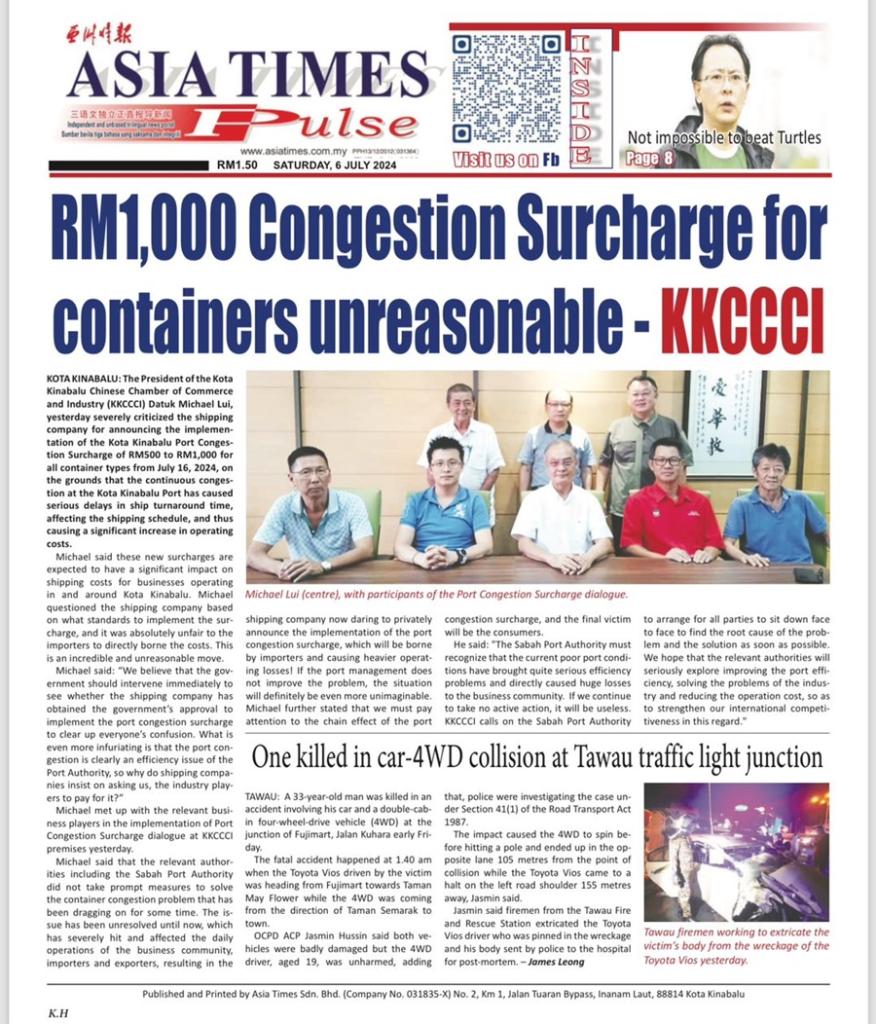 Persatuan Pengusaha Lori Kontena Kota Kinabalu (PPLKKK) expressed its dismay at the implementation of congestion surcharge by liners at Kota Kinabalu port. Shipping Lines just unilaterally imposed this surcharge, and seems to be enjoying an exception under the competition laws, and we are therefore at their mercy. Sabahans are suffering from high cost of living and this will make it worst. The newly formed Sabah Logistics Council should act fast and also find a way to regulate fees charged by shipping lines into Sabah. The authorities too should examine and expedite the port expansion without further delay.