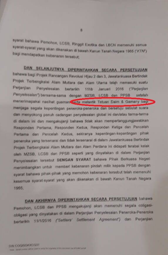 Firma Daim & Gamany diberi tanggungjawab sebagai menguruskan wang diterima dari bayaran jualan tanah RM1.18 billion kepada Eco World yang mana jualan itu adalah jualan paksa terhadap Mujur Zaman, Liputan Canggih dan lain-lain pihak yang dapat PA untuk bangunkan tanah Peneroka PKPS di Ijok.