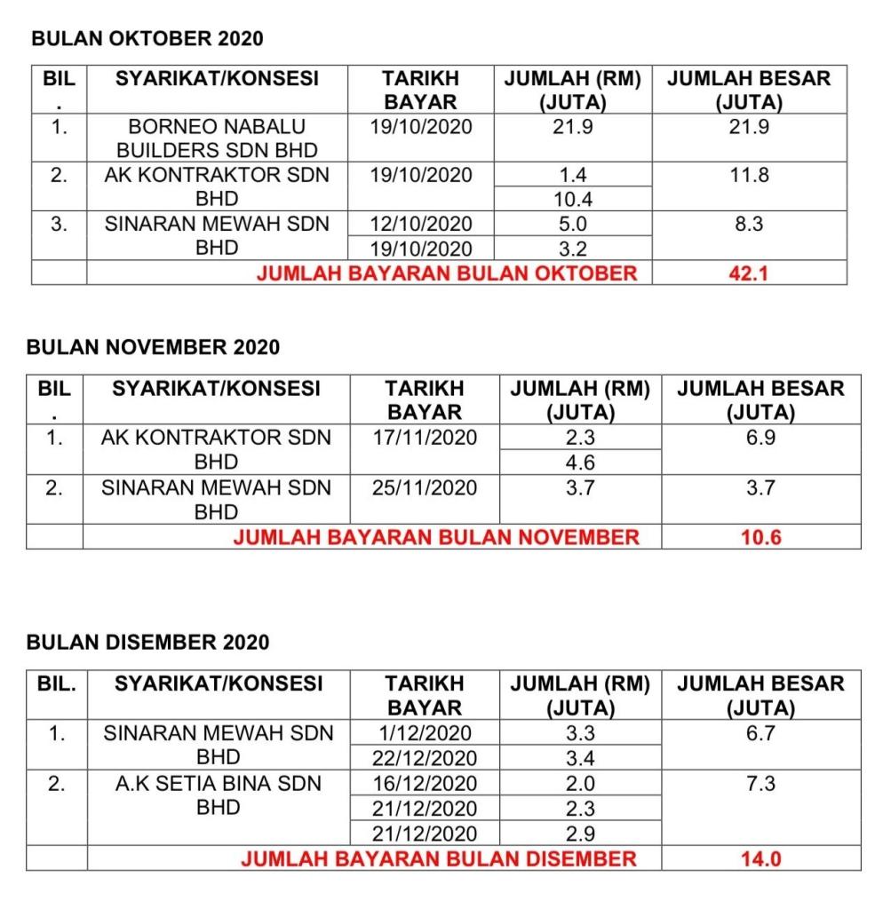 Semakan bayaran konsesi kepada Borneo Nabalu Builders Sdn Bhd lebih luar biasa kerana selepas PRN Sabah pada 26 September 2020, Konsesi Nabalu mendapat SECARA PUKAL RM21.9 JUTA pada 19 Oktober 2020. Bagaimana mereka boleh dibayar sebanyak RM 21.9 juta? Apa agaknya mereka buat di Tawau, Lahad Datu, Semporna dan Kunak? Mengapa Azam Jaya dibayar paling banyak berbanding syarikat lain?