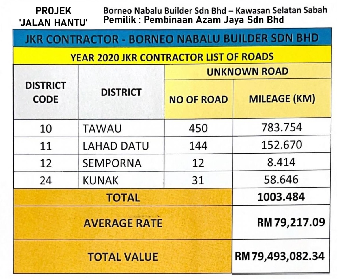 Syarikat ini teribat 637 jalan hantu dengan 450 jalan dikesan di Majlis Perbandaran Tawau dan Lahad Datu 144 jalan. Panjang jalan ialah 1003.484 kilo meter dengan anggaran kerugian Kerajaan Sabah ialah RM79,493,082.34. Mengapa agaknya Pegawai JKR memperbanyakkan Nabalu Builders dan Azam Jaya jalan hantu? Disitu ada projek besar disitu senang nak bayar wang!