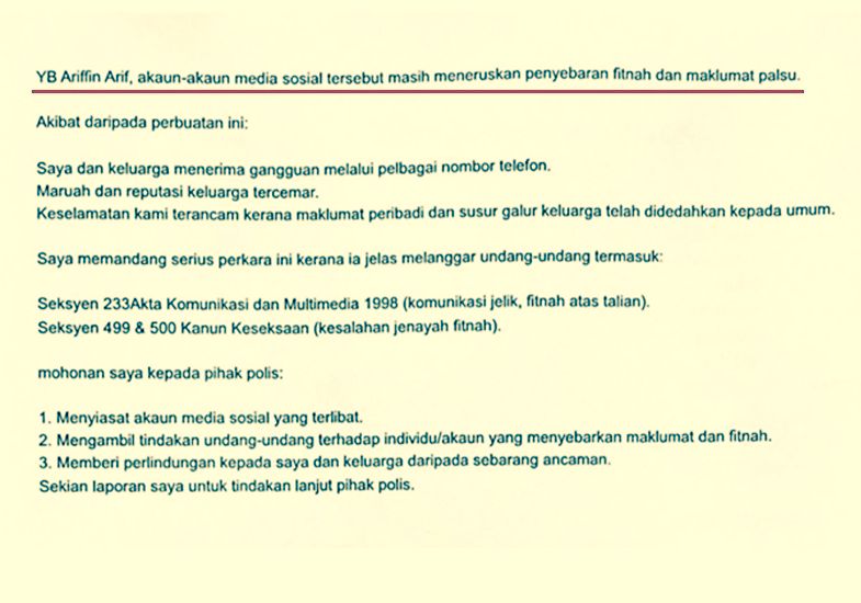 “Saya, Mohd Ariffin bin Akiah… ingin membuat laporan berhubung penyalahgunaan media sosial yang menjejaskan keselamatan dan maruah keluarga saya,” jelasnya dalam laporan.