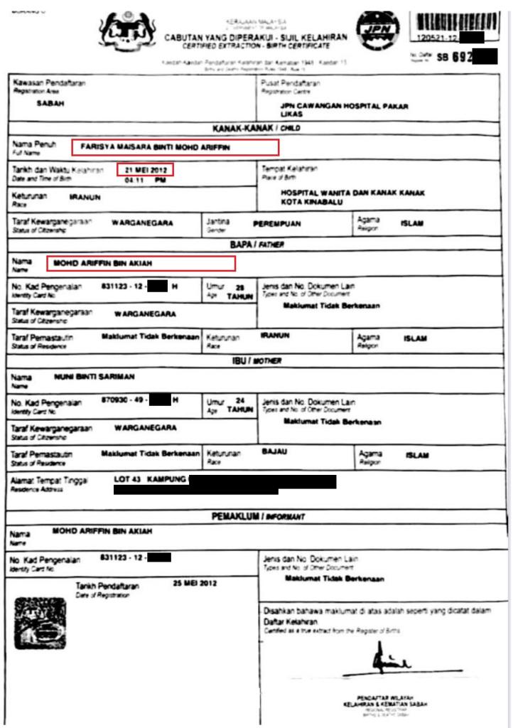 Bagi membuktikan hal ini salinan sijil kelahiran rasmi JPN menunjukkan Farisya Maisara dilahirkan pada 21 Mei 2012 di Hospital Wanita & Kanak-Kanak Likas. Bapanya ialah Mohd Ariffin bin Akiah, manakala ibunya ialah Nunu binti Sariman. Bapa berketurunan Irranun dan ibu suku Bajau. Bangsa Irranun masyarakat yang tegas, berani dan kuat mempertahankan maruah. Namun Mohd Ariffin Akiah nampaknya penakut beliau menyembunyikan kebenaran dan membiarkan sumpah seranah netizen kepada pihak yang tidak bersalah. Jika ada harga diri tampil ke depan akui anak sendiri dan nyatakan sebagai saksi kes.