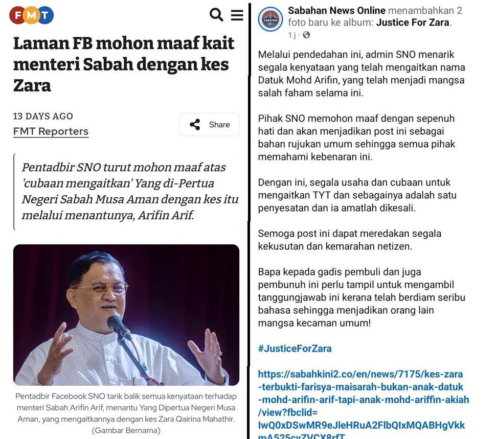 Pendedahan Sabahkini2 pada 19 Ogos lalu mengenai bukti Farisya Maisara bukan anak Datuk Mohd Arifin Arif tapi anak Mohd Ariffin Akiah dalam kes Zara mendapat respon yang perlbagai termasuk permohonan maaf sebuah pengendali facebook Sabah News Online (SNO) dan laporan polis oleh Mohd Ariffin Akiah.