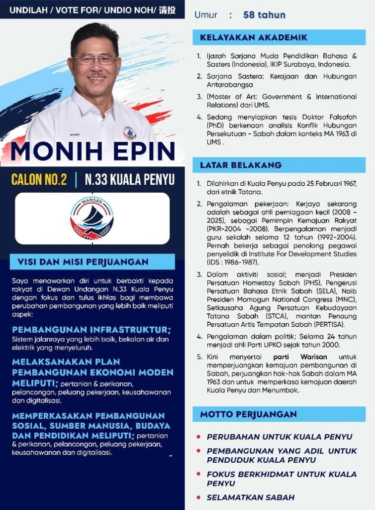 Selepas lebih sedekad tenggelam daripada radar politik tempatan, nama Monih bin Epin, 58, kembali muncul sebagai calon Parti Warisan untuk N.33 Kuala Penyu. Kemunculan ini dianggap mengejutkan ramai penduduk kerana sosok ini lama tidak kelihatan dalam aktiviti masyarakat dan isu-isu setempat — namun tiba-tiba muncul sebagai calon “favourite” Warisan setelah dikatakan mempunyai kapasiti kewangan sebagai kontraktor yang mampu menanggung kos kempen pilihan raya.
